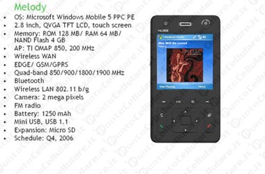 L' HTC Melody sarą un terminale Windows Mobile con display touchsceen a risoluzione QVGA, compatibile con le reti mobili EDGE/GPRS/GSM, con connettivitą Wi-Fi b/g e Bluetooth. Si tratterą di un cellulare con ampie funzionalitą multimediali, vista la presenza dei tasti frontali per il controllo della riproduzione musicale, del sintonizzatore radio FM e della memoria espandibile con schede microSD. Atteso sul mercato entro la fine dell'anno, il Melody sarą dotato inoltre di fotocamera da 2.0 megapixel ed una memoria interna di ben 4GB.