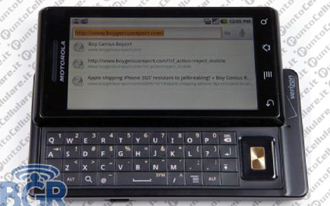 MOTOROLA ANDROID CERCA Ancora notizie in anteprima su Droid, il nuovo telefonino Android con tastiera QWERTY in arrivo nelle prossime settimane da Motorola. Le immagini dal vivo che vi proponiamo mostrano nel dettaglio il Motorola Droid (noto anche con i nomi di Sholes e Tao), grazie ad un esemplare personalizzato con il logo del gestore mobile statunitense Verizon Wireless sulla scocca.