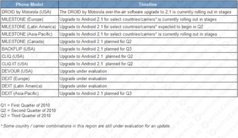 MOTOROLA ANDROID CERCA Dopo il rilascio dell'attesissimo aggiornamento ad Android 2.1 per lo smartphone Motorola Milestone, emergono anche i progetti di aggiornamento della casa statunitense per gli altri suoi cellulari basati sulla piattaforma operativa di Google. Da un documento riservato viene confermata la disponibilità nel corso dell'estate di un aggiornamento ad Android 2.1 per il Motorola Backflip, mentre per il Motorola Dext nulla è stato ancora deciso.