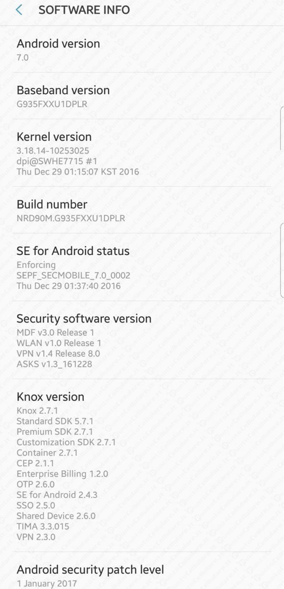Il firmware ha build version G935FXXU1DPLR (per il Galaxy S7 Edge) ed introduce le patch di sicurezza Android per il mese di gennaio. Il rilascio ad una cerchia ristretta di utenti dovrebbe rappresentare una sorta di 'soak test', in vista della distribuzione su larga scala qualora non dovessero registrarsi inconvenienti. L'aggiornamento in distribuzione è basato sulla versione 7.0 di Android, non sulla versione 7.1 come alcune fonti avevano anticipato.