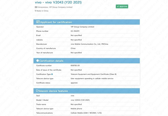 Vivo ha lanciato il Y20 ad agosto, ma è già pronta a svelarne l'evoluzione con il Y20 (2021). Lo smartphone, identificato dal codice prodotto V2043, ha ricevuto questa settimana il via libera in Thailandia da parte della NBTC.